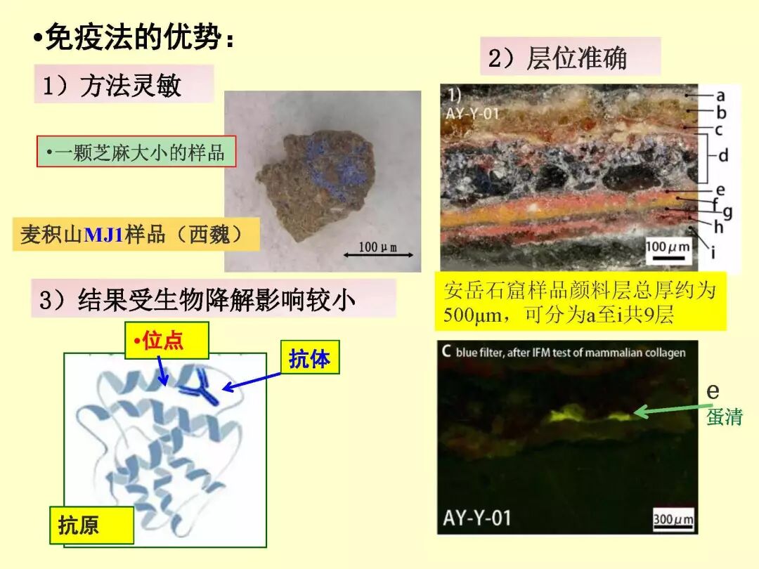 免疫分析技术是利用抗体与抗原的特定结合关系而进行检测的技术,具有高度的选择性和灵敏度。报告中介绍了秦始皇兵马俑彩绘胶结物检测;麦积山泥塑和壁画胶结物检测;须弥山石窟泥塑和壁画胶结物检测等案例。尤其在跨湖桥遗址发现的中国最早独木舟的材料检测中,严谨地证明了中国利用大漆的历史有8000年以上。化学分析和免疫分析都需要根据被检物质的具体特征进行设计,特别是免疫分析鉴别力强,精度高,耗样品量少,将成为未来考古和文保领域最重要的检测方法之一。