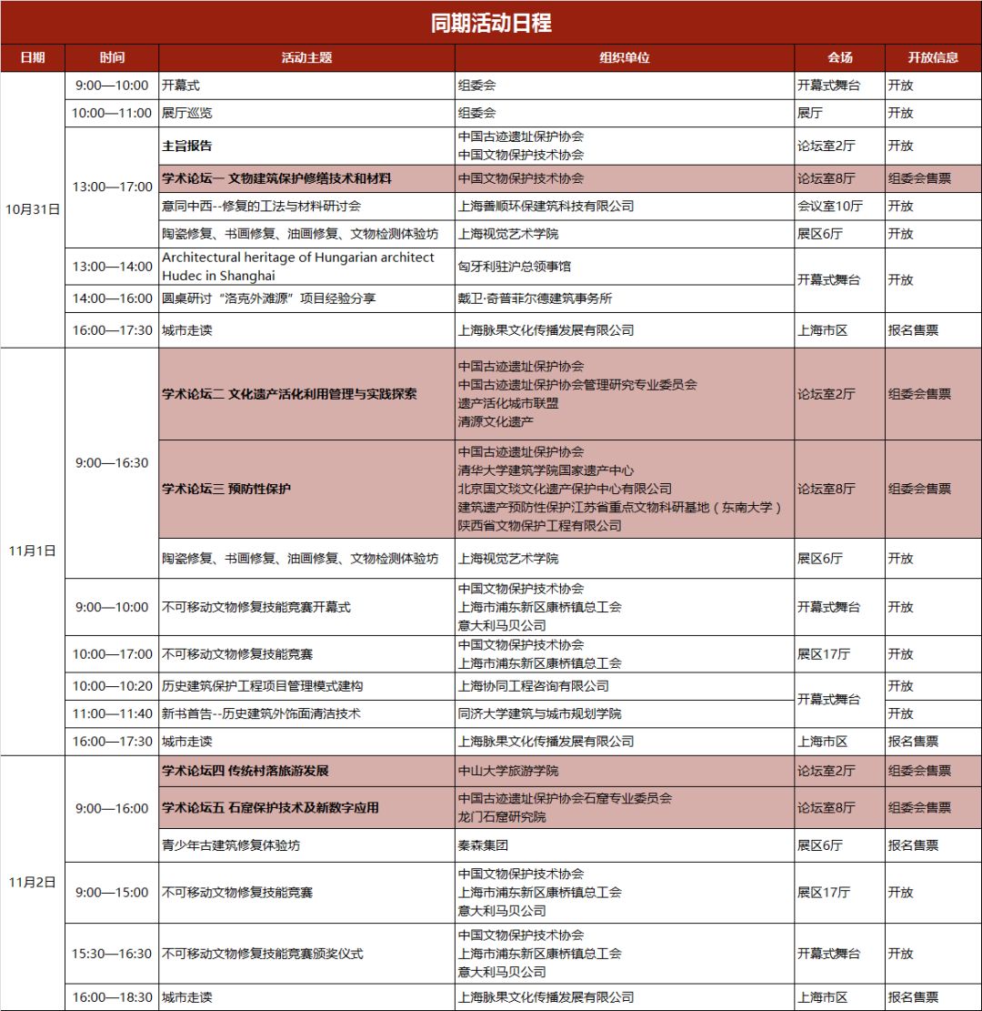 本届上海国际建筑遗产保护与修复博览会安排精彩同期论坛,共设置有文物建筑保护修缮技术和材料,文化遗产活化利用管理与实践探索,预防性保护,文化遗产活化利用与旅游开发,石窟保护技术及新数字应用等五个主题分论坛。